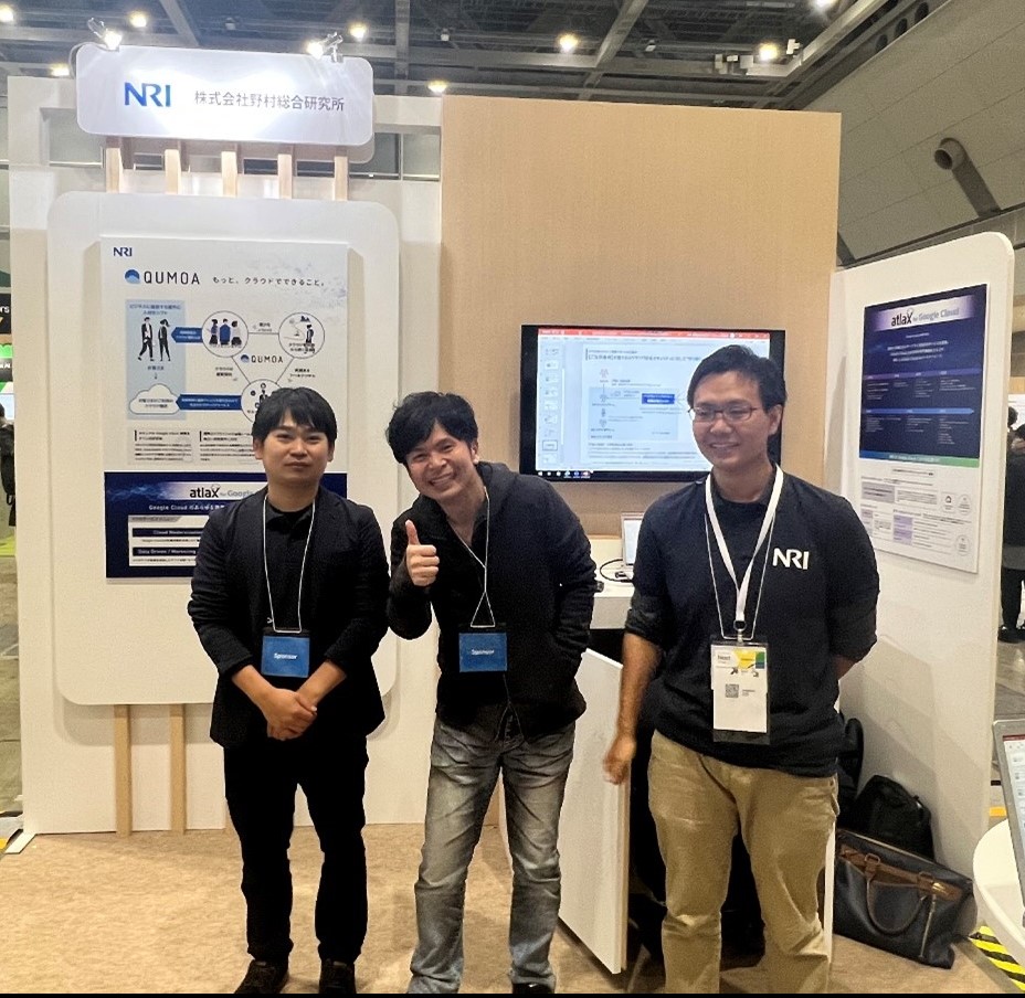 NRIのブースでは、デジタル トランスフォーメーション(DX)に関するコンサルティング、および Google Cloud 導入の検討支援から システムの 設計・構築・運用まで、一括でご提供できるatlax for Google Cloud とそのソリューションの一つであるパブリッククラウド運用サービス「QUMOA」をご紹介していました。